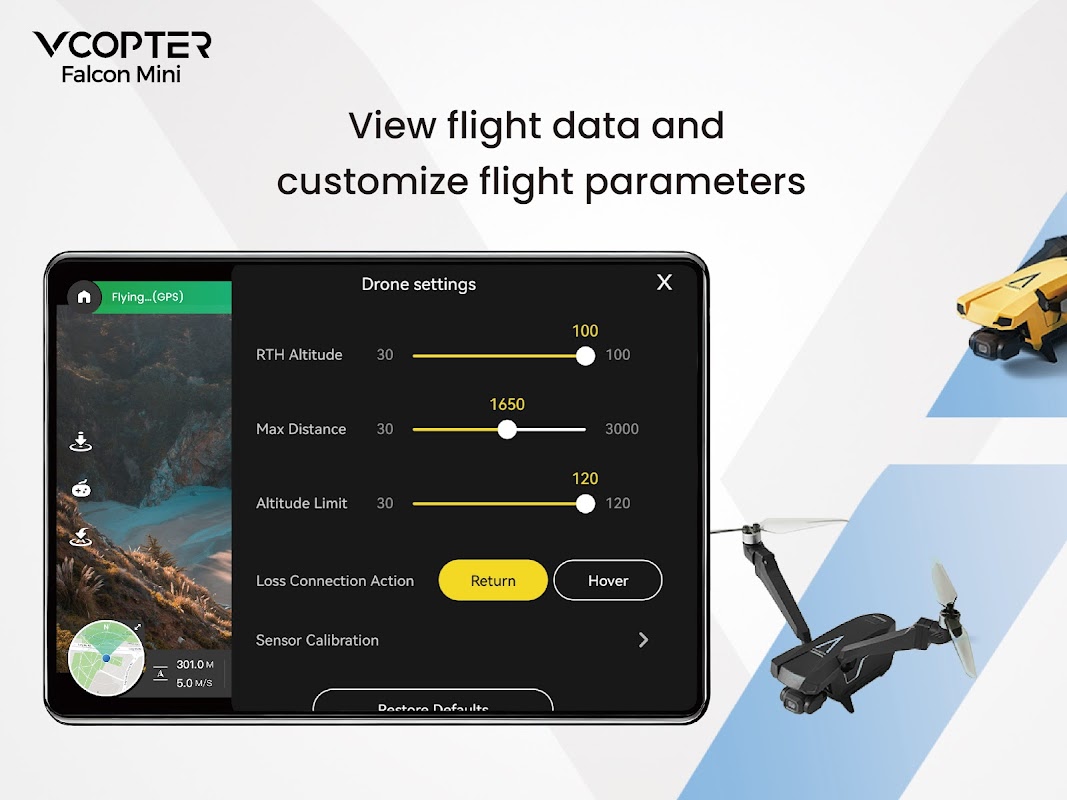 O aplicativo V-Copter foi desenvolvido para o drone V-Copter Falcon Mini.