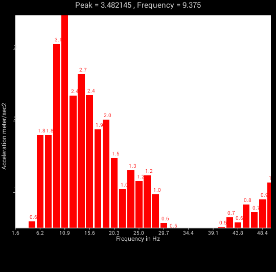 As a practical example, you can keep the SmartPhone on a motor casing with Z axis selected. As the motor runs, the whole body undergoes vibration. Assume the motor runs at 600rpm (10Hz). So if you have placed the SmartPhone correctly you should see the frequency peaking near 10Hz. If there is misalignment or imbalance there will be some other frequencies which will produce noise.