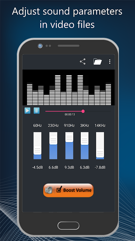 Video Sound Equalizer é um aplicativo simples que permite modificar os parâmetros de áudio em cada arquivo de vídeo. Então você pode compartilhar os arquivos de resultado com seus amigos.