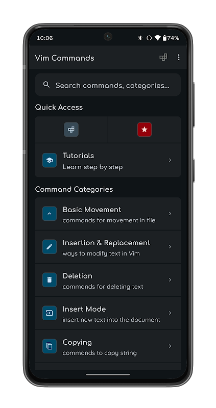 Se você é novo no Vim ou um profissional experiente, este aplicativo tem algo para todos. Navegue por nossa lista abrangente de comandos para encontrar o que você precisa ou pesquise comandos específicos usando nosso recurso de pesquisa intuitiva.