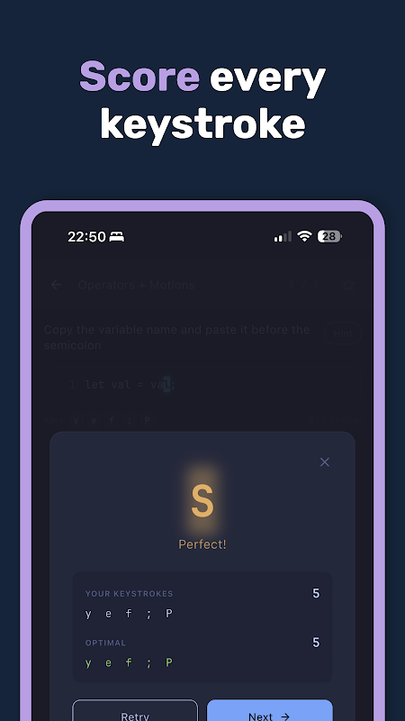 Cada exercício gera uma nota de S (perfeito) a D (continue praticando). Após a conclusão, o aplicativo mostra a solução ideal ao lado da sua para que você possa ver exatamente qual comando teria sido mais curto. Tente novamente para melhorar sua nota.