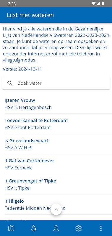 Ao fazer login com sua conta MySportvisserij, seus documentos de pesca ativos são recuperados e as águas onde você pode pescar são coloridas em azul (veja a legenda para mais informações).