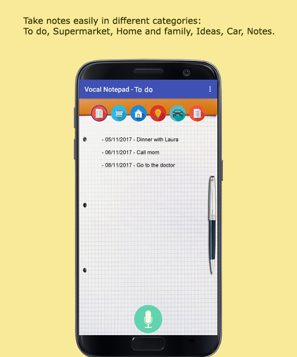 Vocal Notepad é um aplicativo útil e muito leve para tomar notas de lembrete com reconhecimento de voz. É perfeito para quando você estiver com pressa e você quer tomar rapidamente uma nota. Você pode tomar notas em diferentes categorias: as minhas tarefas, supermercado, casa e família, ideias, carro, notas, e você pode compartilhar cada lista.