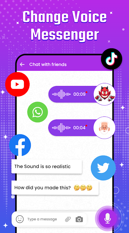Os efeitos de voz engraçados podem criar efeitos de áudio incríveis e legais. Grave sua voz com som de alta qualidade ou música de abertura, aplique efeitos e compartilhe-os com seus amigos e familiares.