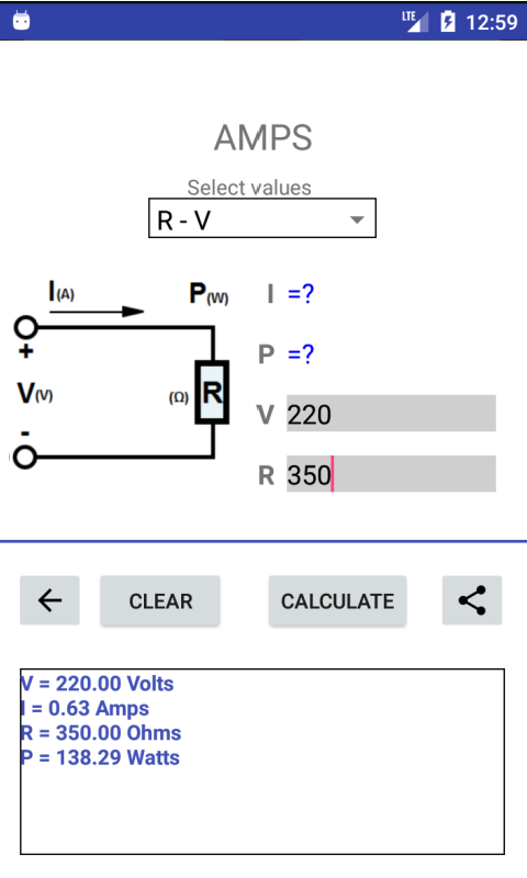 Calcula voltagem em Volts, corrente em Amperes, potencia em Watts e a resistência em Ohms.