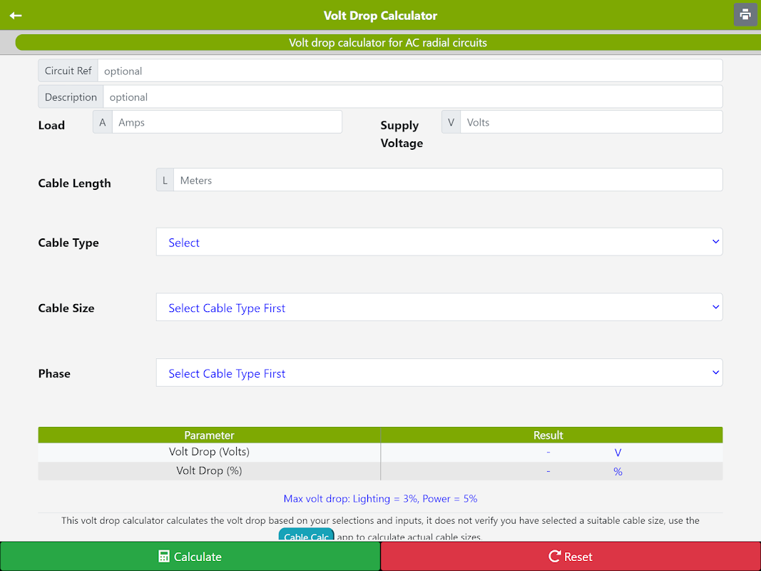 Calculadora de queda de tensão para calcular a queda de tensão para circuitos e cabos elétricos, salve como arquivo PDF ou imprima os resultados do cálculo de queda de tensão diretamente do seu dispositivo Android.