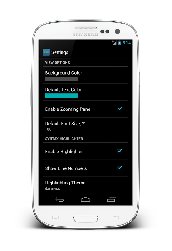 - Não é possível editar o código-fonte diretamente no aplicativo. No entanto, você pode usar o item de menu "Copiar tudo" para copiar código fonte não formatado e colar no editor de texto externo ou você pode usar "Share" ou "Salvar arquivo" itens do menu.