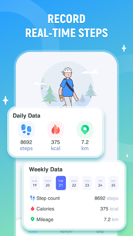 Apresentaremos seus dados de exercícios na forma de gráficos de relatório, que podem visualizar dados diários e semanais de caminhada e calorias queimadas. Ajudá-lo a atingir seus objetivos de perda de peso.
