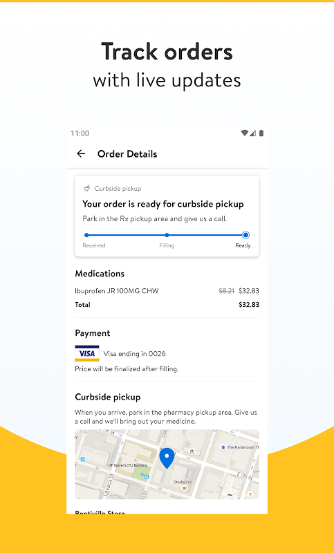 • Solicite recargas de receitas e receba atualizações de status do seu pedido no Walmart Pharmacy