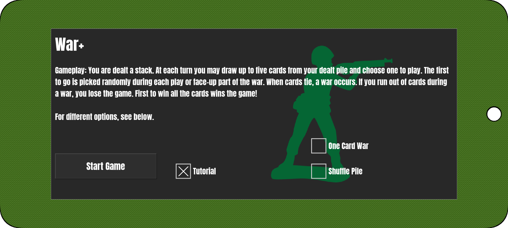 War+, um jogo semelhante ao popular jogo de cartas War, porém mais desafiador. War+ permite que você escolha as cartas que quer jogar. Escolha suas próprias batalhas e junte-se à diversão do War+ com muitas opções e muita diversão.