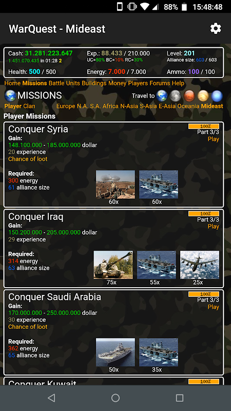 O WarQuest for Android é um jogo online grátis para múltiplos jogadores (MPOG) com uma zona de guerra com milhares de jogadores. WarQuest leva você para o ano de 2020. O mundo está em guerra. O objetivo do jogo é defender seu país e conquistar outros. Compre armas e unidades de produção, jogue missões, lute, crie aliados e torne-se o melhor jogador do seu país. Entre na zona de guerra se você ousar!