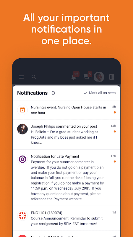 - Receba notificações importantes do Campus Nexus, Canvas e Handshake