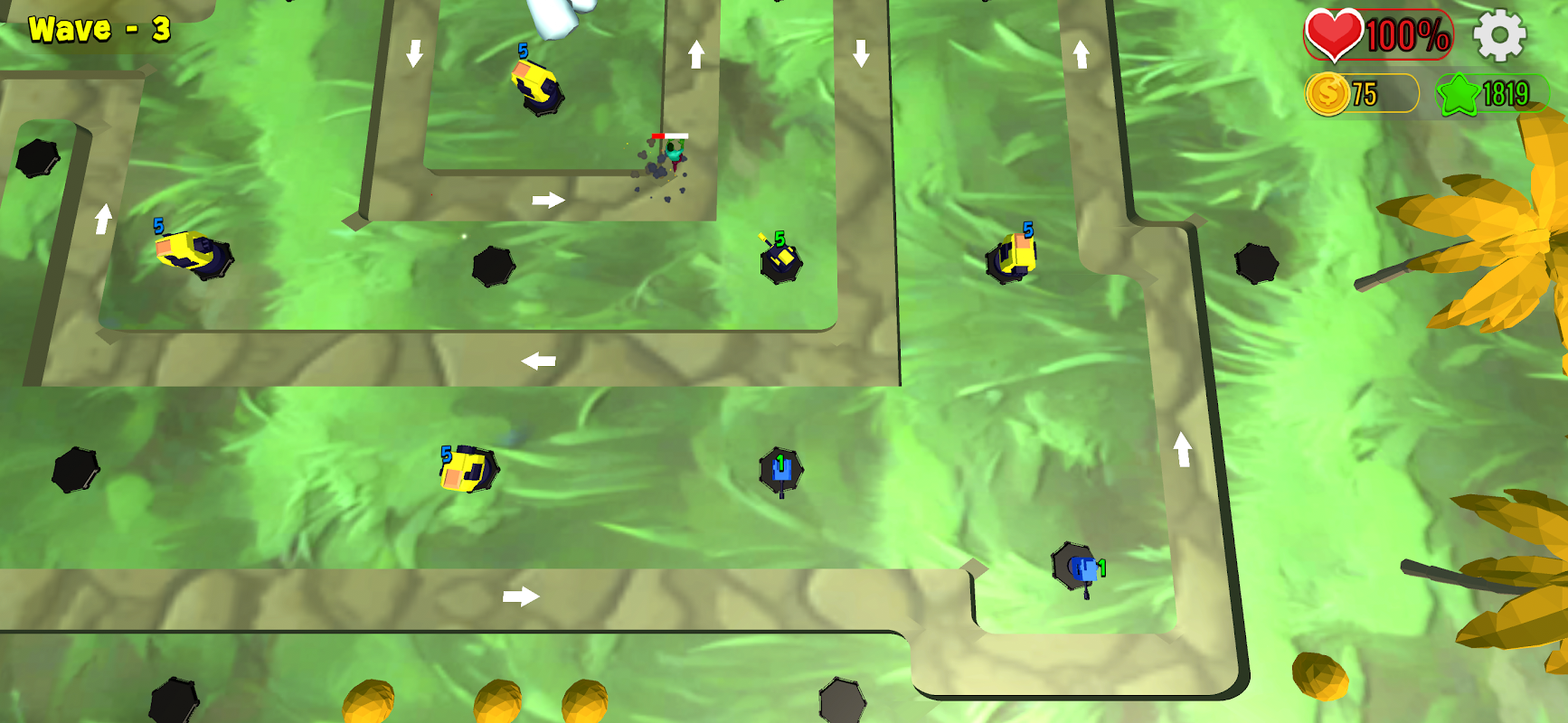 Existem 3 tipos de torre: Torre: Elas podem mirar em um único inimigo e causar uma pequena quantidade de dano. Lançador: Lança um míssil e causa dano em área, e então Torre Laser, que causa dano ao longo do tempo.