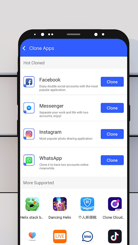 📱Gerencie várias contas em um dispositivo móvel e aproveite a conveniência de armazenar contas pessoais e profissionais separadamente. Mais contas de jogos e mais diversão! Os usuários podem clonar vários aplicativos de jogos para Android e reproduzi-los simultaneamente.