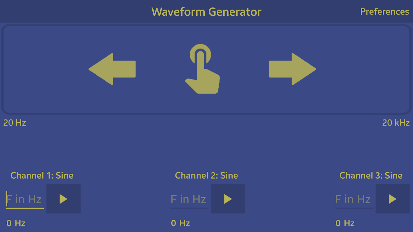 Either set a specific frequency and have it play constantly, or dynamically change the output frequency by swiping your finger on the upper half of the screen.