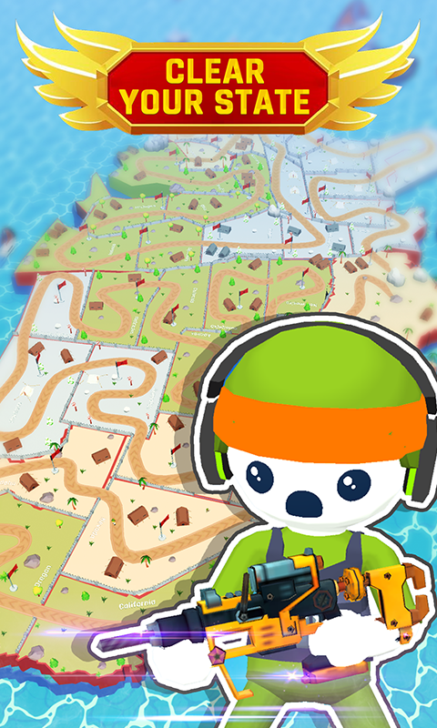Após o término da pista, leve sua arma evoluída para uma zona de combate de jogo livre. Controle seu personagem para eliminar inimigos e capturar estados. Domine o campo de batalha e acompanhe seu progresso no mapa, que mostra os territórios capturados e aqueles que ainda aguardam sua conquista.