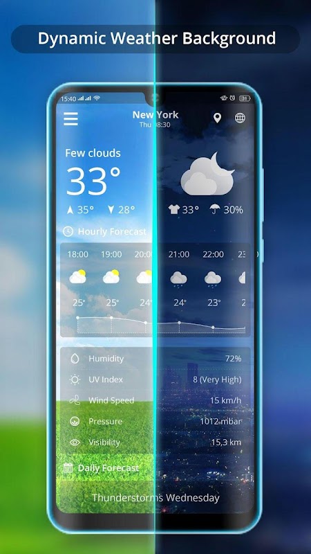 Background screen in Weather App will automatically change according to weather conditions (day, night rain, cloudy, sunny, snow or foggy..).