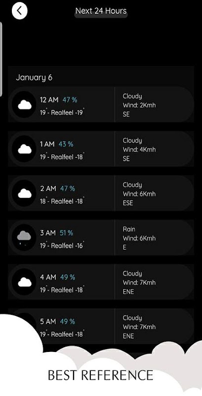You will see weather information update hourly and accurately. Real-time temperature, rain, snow, humidity, pressure, wind force and wind direction.