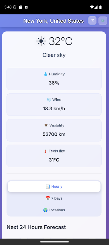 Previsões detalhadas de hora em hora para as próximas 24 horas com temperatura e condições