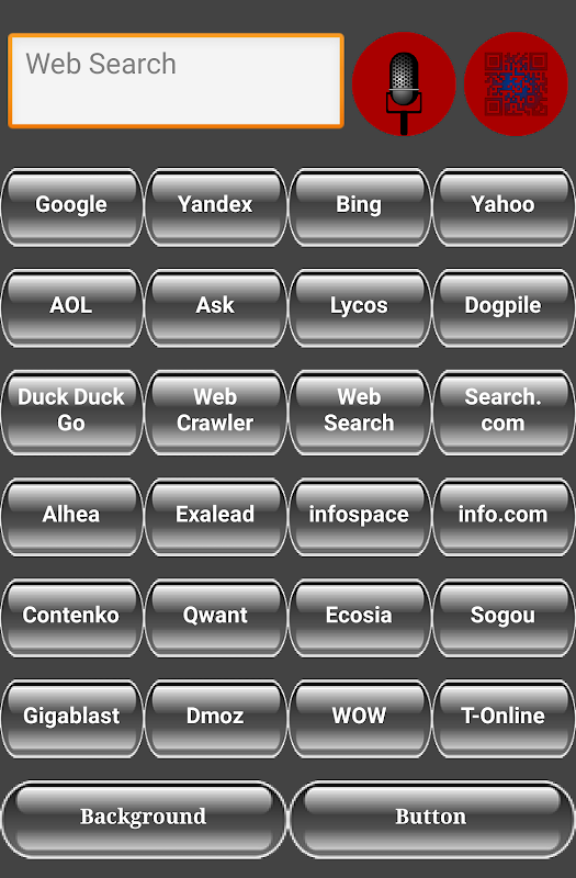 The best search engines are ready at your fingertips such as Google, Yandex, Bing, Yahoo and many more. You can create the Search app according to your color scheme by opening the Background and Button menu at the bottom. There you can select many backgrounds, buttons and text colors freely and create your search app according to your color palate. Type your keyword into the text field or speak the word pure. As well as a barcode scanner you can use for example to scan a product and search in the search engines by clicking and compare in the best search engines. You only have to enter your search keyword or scan the product EAN / QR. Then you can select your favorite search engines or click to search for more search results such as how to open multiple search engine apps one at a time or open and search with all engines in the web browser at the same time. The web search engines app is easy to use and allows for uncomplicated searching and quick comparing in the world wide web!