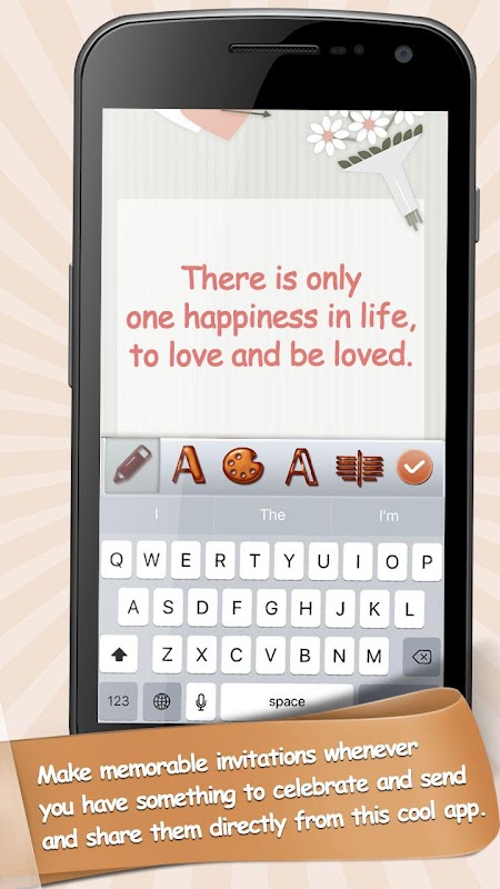Em apenas algumas etapas fáceis você pode fazer seus próprios cartões do casamento. Esta aplicação é muito simples e fácil de usar. Depois de fazer o download e instalar este aplicativo do smartphone, escolha um plano de fundo do cartão. Quando você encontrar seu modelo perfeito do cartão adicione seu próprio texto à foto, a uma mensagem especial ou a umas citações românticas, incumbe você. Depois de escrever a mensagem de texto personalizada, altere o estilo da fonte. Você também pode alterar a cor das letras eo contorno do texto. Ajustar o texto alinhar ao seu gosto, e lá você tem! O cartão perfeito do convite do casamento! Você pode mesmo fazer convites feitos sob encomenda para cada convidado! Salve-o em seu dispositivo para que você possa usá-lo como papéis de parede do telefone ou excluí-lo. Desfrute destas características de aplicação legal! Obtenha inspirado por nossa coleção surpreendente das imagens! Não espere mais para experimentar este fabricante de cartões e ficar atordoado!