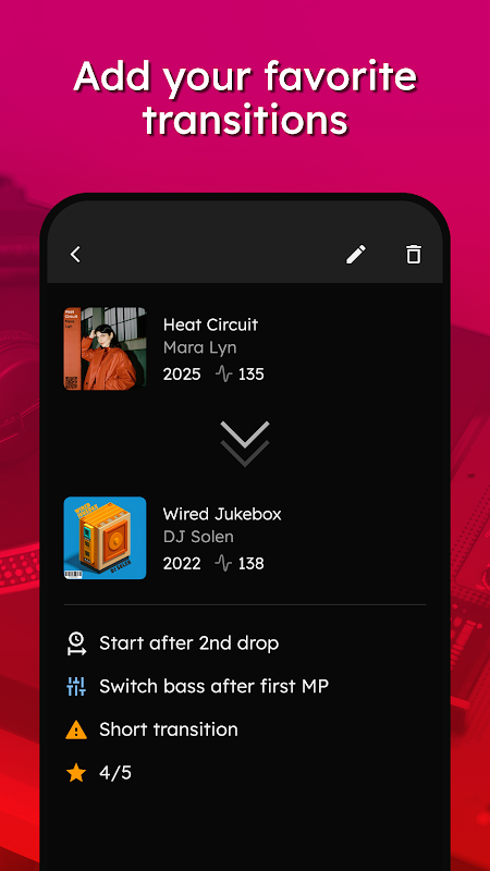 - Salve suas transições favoritas: quais faixas mixam melhor, em qual direção e com todas as notas técnicas necessárias.