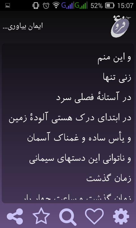 جستجو : با جستجوی کلمه مورد نظر در تمامی اشعار , لیست مصراع های یافت شده بر اساس کلمه مورد نظر به شما نشان می دهد و با انتخاب هر یک از مصراع ها به شعر مربوط به نمایش در می آید
