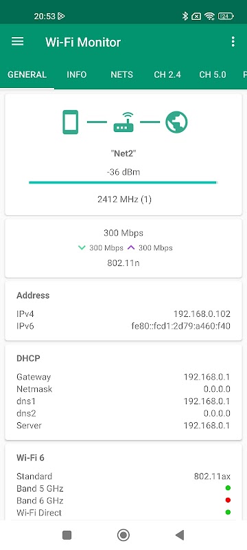 - os gráficos das redes disponíveis por canais agrupados em 2,4 ou 5,0 GHz