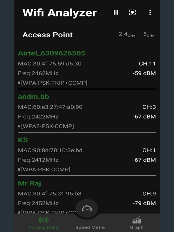 WiFi Analyzer é um aplicativo gratuito, rápido e seguro que ajuda a analisar redes Wi-Fi de 2,4 GHz e 5 GHz. O analisador de rede ajuda você a encontrar os melhores canais e locais para o seu roteador, melhorando o desempenho da sua rede. Ele funciona como scanner wifi e encontra uma lista de redes Wi-Fi próximas com detalhes como intensidade do sinal, endereço MAC, frequência, canal e tipo de segurança, protocolo de segurança Wi-Fi WPA2-PSK CCMP e toma decisões informadas para otimizar a eficiência.