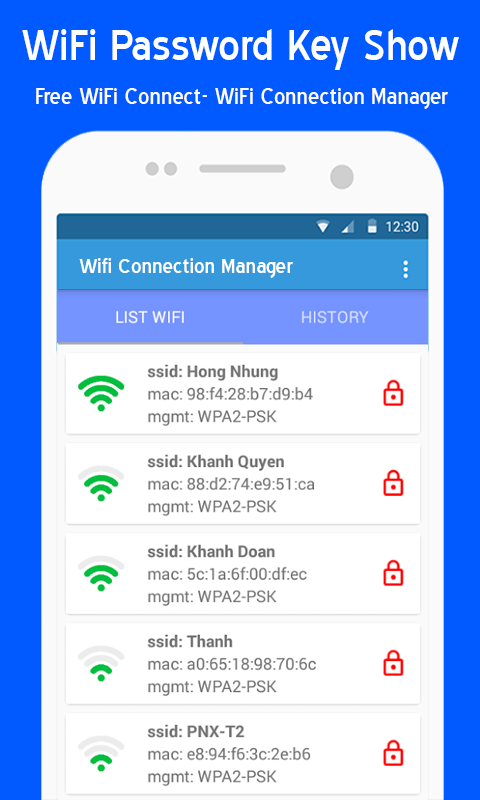 Chave mestra de senha WiFi Mostra recupera a senha WiFi, localiza, conecta e gerencia redes WiFi. É um aplicativo de senha WiFi perfeito para o seu telefone! WiFi connection Manager é uma ferramenta WiFi para você analisar suas redes e ajudá-lo a se conectar aos melhores sinais disponíveis! Se você está procurando o melhor gerenciador, otimizador e analisador de dispositivo wi-fi, esta ferramenta de rede deve ser sua primeira escolha!