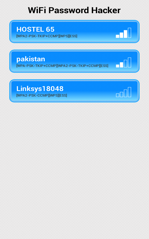 Start the scanner app , You will see all the wifi networks in range in either good or bad signals. Tap the network you want to hack, Hacking simulation will be started, at the end a fake password will be generated.