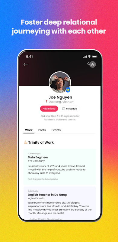 Conecte-se com outros membros por meio do nosso abrangente sistema de amigos. Veja perfis detalhados que mostram a trajetória profissional de cada membro por meio do nosso conceito exclusivo "Trindade do Trabalho" – destacando cargos em tempo integral, trabalhos paralelos e talentos ocultos.