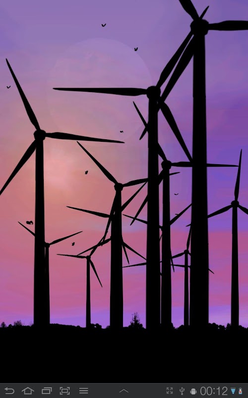 Live wallpaper dinâmico com giro turbinas eólicas sob nuvens em movimento.