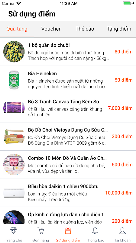 + Khuyến mại hấp dẫn: Với điểm tích được, quý khách có thể đổi sang quà bằng hiện vật, thẻ nạp điện thoại hoặc áp dụng cho mua đơn hàng.