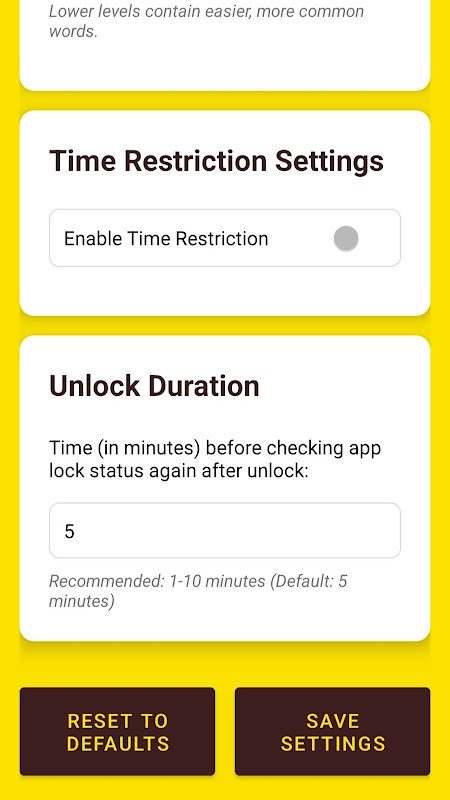 WordLock é um bloqueador de aplicativos exclusivo que ajuda você a aprender novas palavras em vários idiomas enquanto gerencia o uso do seu aplicativo. Em vez de usar um padrão ou PIN, você desbloqueará aplicativos selecionados lendo uma palavra, verificando seu significado e ouvindo sua pronúncia. Uma combinação perfeita de produtividade e aprendizado de idiomas. 🔑 Recursos: • Bloqueie aplicativos selecionados com um desafio de vocabulário • Aprenda palavras em inglês, coreano, japonês, espanhol e muito mais • Ouça a pronúncia usando o texto para fala (TTS) integrado • Defina um tempo de espera personalizado e um cronograma de bloqueio • Acompanhe seu progresso com o login do Google e a integração com o Firebase • Ideal para estudantes, alunos de idiomas e desintoxicação digital 📚 Aprenda a desbloquear. Estude para se concentrar. 🔒 Divulgação de acessibilidade: Este aplicativo usa a API AccessibilityService para detectar quando os aplicativos selecionados são abertos, a fim de exibir a tela do desafio de vocabulário. Nenhum dado pessoal é coletado ou compartilhado.