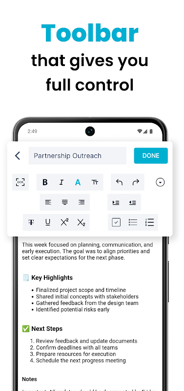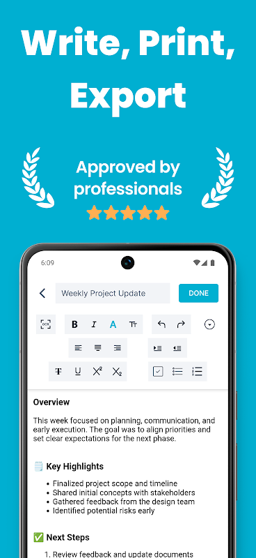 O Wordpad Plus também funciona como um conversor de documentos e leitor de texto para Android. Importe, edite e exporte arquivos com facilidade. Converta seus textos em PDFs profissionais ou use a tecnologia OCR para digitalizar notas manuscritas. Você pode até assinar documentos no Android com facilidade, tornando o Wordpad Plus um parceiro confiável para propostas comerciais, modelos de documentos jurídicos ou relatórios acadêmicos.