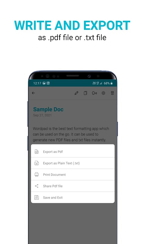 Escreva no wordpad e obtenha seu documento como arquivo pdf ou txt com um único clique. Você pode usar o recurso de impressão direta para imprimir seu documento ou nota.