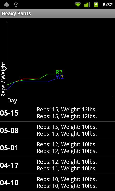 The History calendar lets you easily review and edit previous days' workouts, as well as view your progress in any exercise as a graph! You can also email yourself a complete workout and journal log at any time!