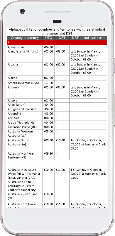 Todos os fusos horários mundiais observados estão listados por país (ou território) na tabela abaixo. Existem estados independentes com vários fusos horários, e o recordista é a França com 12 fusos, mas 11 deles são usados em áreas ultramarinas e apenas um no continente do país. A situação é a mesma no Reino Unido, Dinamarca, Nova Zelândia, Holanda.
