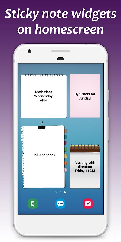 WritePad has a notes widget reminder. To access it, go to your Android home screen, press for a few seconds on any empty space. You will notice the "Widgets" option, where you can find Notes app. There are 7 different sizes for notes widget reminder to choose from.