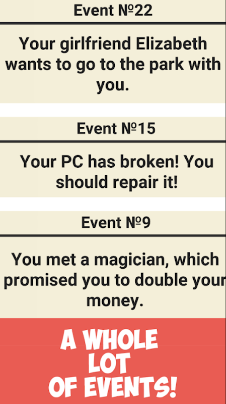 -Random events: you can go shopping and accidently lose your money, or you might get robbed, or you can find some money. And there is a whole lot of different random events out there!