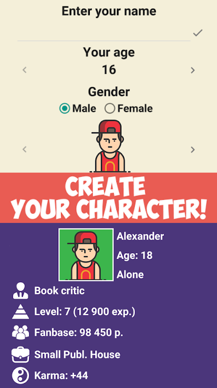 "Writer Simulator" – classic 2D game, getting everything best of the genre! You are about to take the path from a beginning writer to a founder of your own corporation. The game gives you these features: creating your character, writing your own books, different types of jobs, business creation, finding your love, different random events, karma system, different types of choices, competition with friends, achievements and easter eggs!