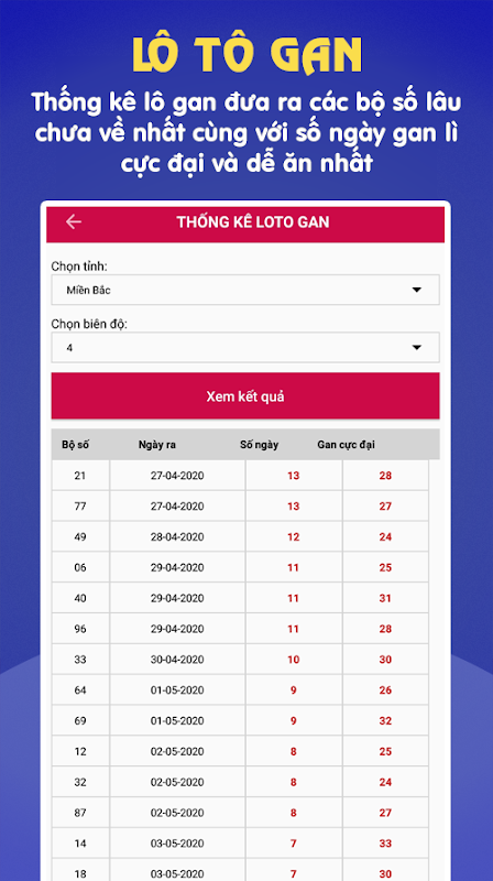 Todos os dias, a loteria do Norte é sorteada em diferentes províncias e o KQXSMB é usado para toda a área do Norte desde Ha Tinh. As principais funções do aplicativo incluem: