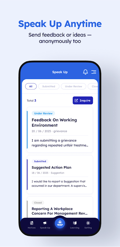 O YEEP vai além das ferramentas básicas de feedback, incentivando a participação ativa, coletando insights operacionais e fomentando o diálogo construtivo dentro das organizações. Com envios anônimos, respostas de administradores e acompanhamento de resultados, é uma ferramenta de comunicação prática, baseada em feedbacks reais de usuários. 💡 Principais Recursos: