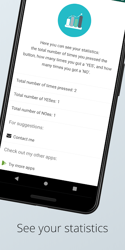 Sua escolha está a um toque de distância. Você nunca sabe o que esperar. Ou você? Este aplicativo apresenta um novo recurso, chamado "chances personalizadas". Ao usar esse recurso, você pode modificar as chances de exibir "Sim" ou "Não" ao tocar no botão. Mas não se preocupe, o padrão é definido em 50%, tornando-o completamente aleatório.