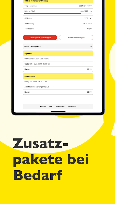 Com o aplicativo yesss!, sua vida fica ainda mais fácil – seja navegando ou fazendo ligações! Você pode acompanhar facilmente seu consumo, custos atuais, suas contas e contas detalhadas dos últimos meses. O aplicativo também fornece todas as informações sobre seu contrato e permite que você ajuste facilmente suas configurações pessoais. Se desejar, você pode ativar pacotes adicionais ou atualizar suas unidades a qualquer momento – otimizando seu plano para atender às suas necessidades.