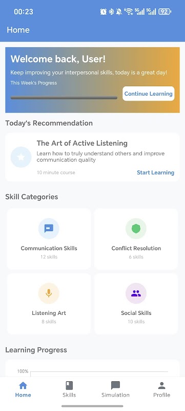 O aplicativo oferece conteúdo de aprendizado rico, incluindo habilidades práticas como comunicação não violenta, escuta ativa e gerenciamento de emoções, tornando os usuários mais confiantes e tranquilos em diversas situações sociais.