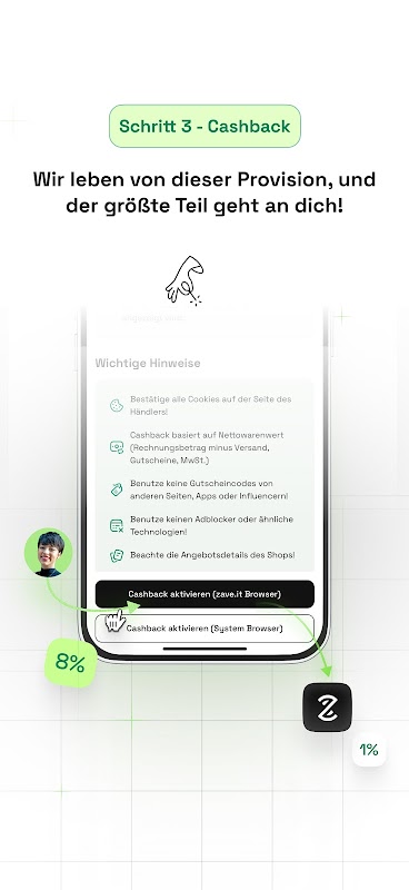 Compre normalmente na sua loja online favorita. Uma parte da sua compra será creditada a você como reembolso. E aqui está o destaque: quanto maior fica a nossa comunidade, melhores negócios podemos negociar para você nas lojas! Com criadores de renome como Dave, Naturensöhne, Robert Marc Lehmann, Papaplatte, Fritz Meinecke, KAYEF e muitos outros ao nosso lado, trabalhamos constantemente para garantir ofertas exclusivas para você. Junto com esses influenciadores e você, estamos transformando o zave.it no aplicativo de poupança definitivo para as gerações Y e Z.