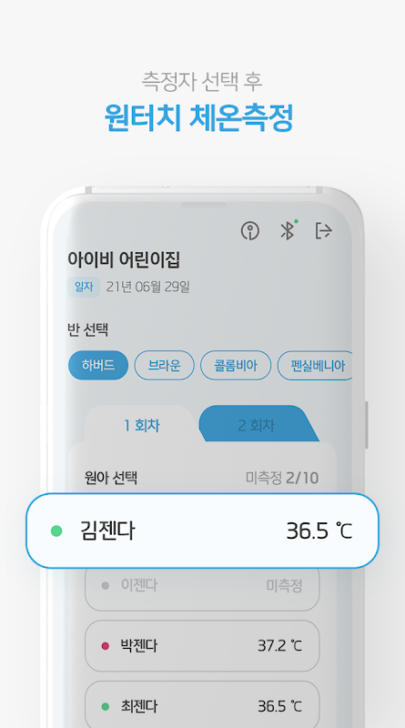 젠다 전용 블루투스 체온계를 사용하여 쉽고 빠르게 체온을 측정하고 원아의 증상 및 조치사항을 메모 할 수 있습니다.