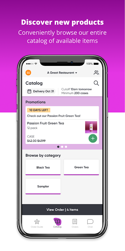 Nosso aplicativo móvel permite que você pesquise nosso catálogo completo de produtos, gerencie e atualize seu guia de pedidos e compre o que precisa no momento em que precisar. Faz parte do nosso compromisso oferecer a você uma experiência de pedido que você vai adorar.